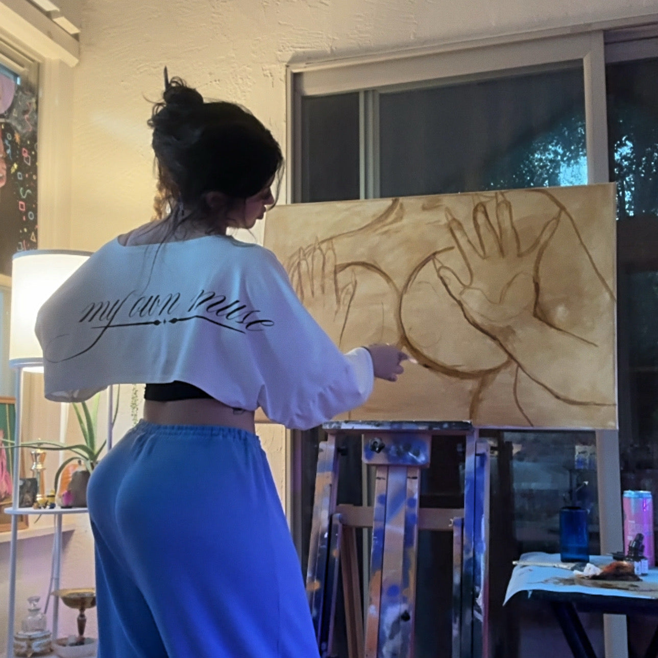 Whether you’re running errands, headed to the gym, or dressing it up for a night out, this lightweight staple has your back- literally. The back features a script My Own Muse with paintbrush details, to remind you that creativity lives in everything you do.