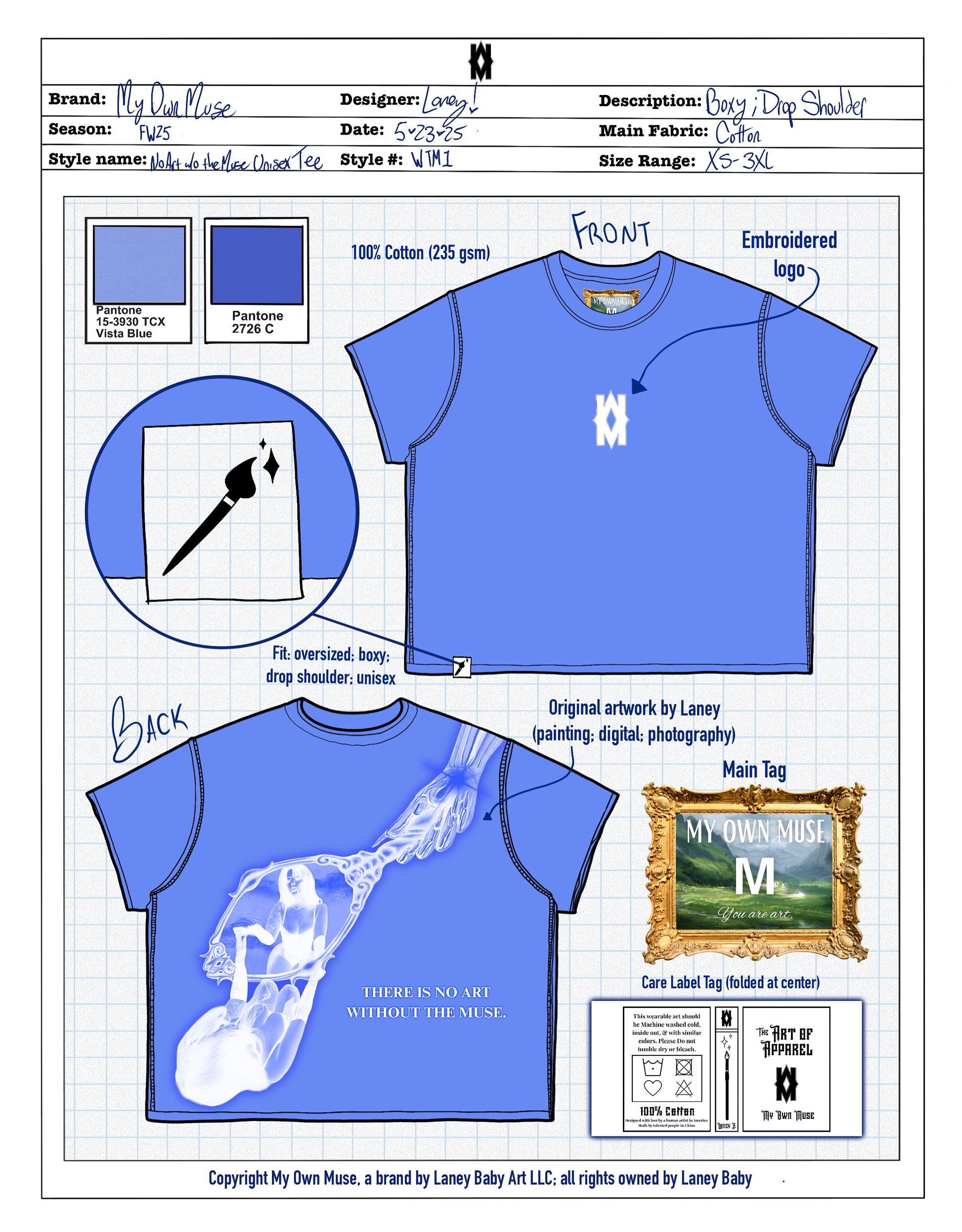 Unlike anything in your closet. Built from 200gsm cotton, it’s thick, structured, and made to last. The front keeps it clean with an embroidered My Own Muse logo, while the back features original artwork created by our artist & founder, Laney. It’s a layered fusion of traditional painting, photography, digital collage, and graphic design. All brought together on a rich periwinkle backdrop that’s bound to start conversations.